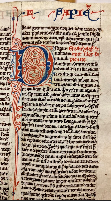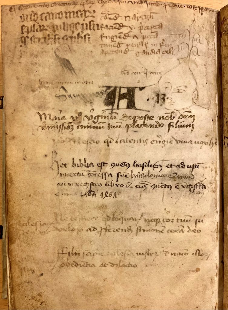Här har vi en bibel. Det är en medeltida handskrift skriven under andra halvan av 1200-talet, troligen i norra Frankrike. Därifrån tog sig denna bibel till ett Dominikankloster i Basel. Det är fullt möjligt att det var klostret som beställde den och som därmed är förste ägare av den, men detta vet vi inte. 1487 lånade klostret ut bibeln till en broder Bartholomeo Zem Wind på obestämd tid. Detta vet vi däremot, eftersom det finns en inskription i boken om att detta skett och att uppgiften även noterats i klostrets katalog. Det finns många noteringar på ett par sidor längst bak i boken. Observera gärna den märkliga figuren som har en julgran som växer upp rätt ur skallen.