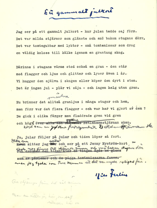 Bibliotekarie Taissia Goriounova bidrar med det här guldkornet av Nils Ferlin. Dikten finns publicerad i tidningen Julblosset (Stockholm), 1955, s. 3.