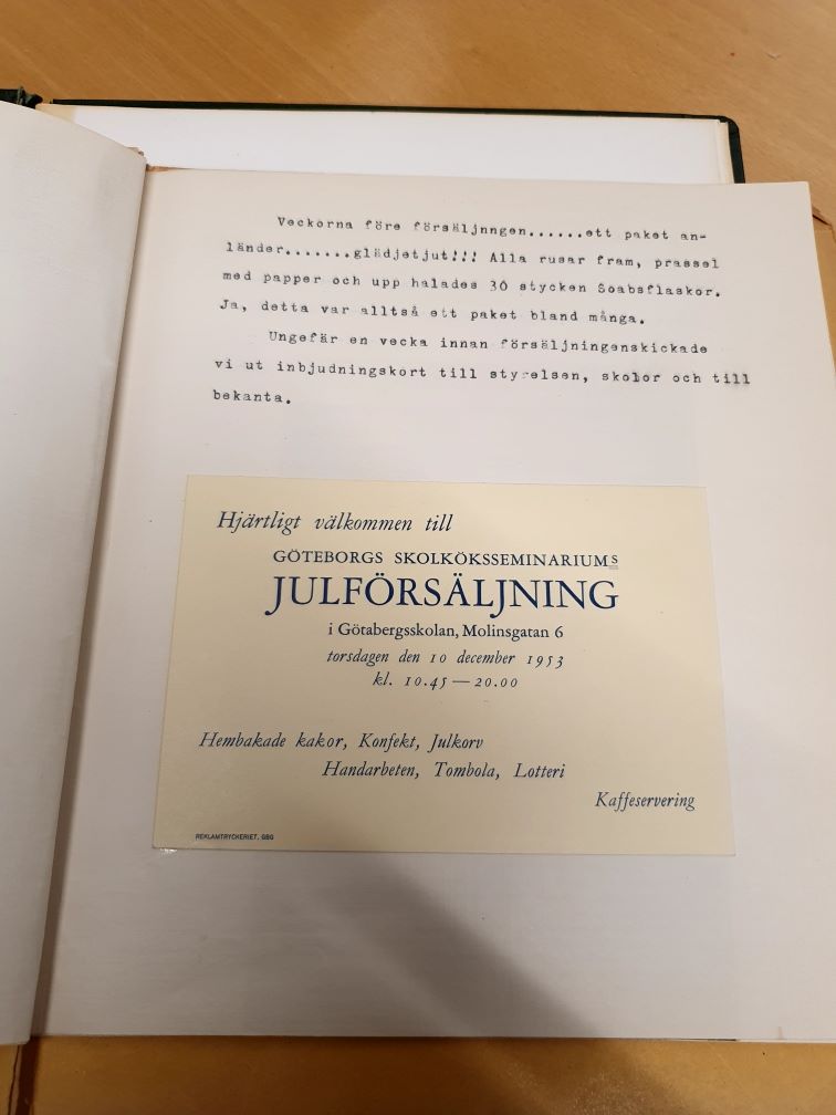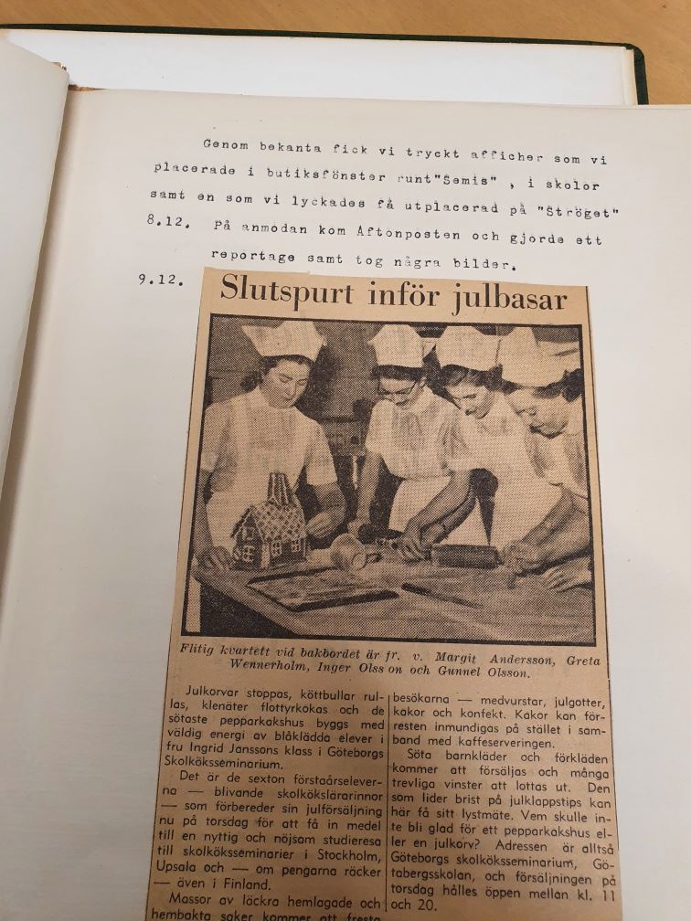 Julen år 1953 ordnade Göteborgs Skolköksseminarium (senare Institutionen för hushållsvetenskap) en julbasar. Det bakades och pysslades i veckor inför tillfället. I KvinnSams arkiv hittar vi minnen från när lärare och elever hjälptes åt att för göteborgarna ordna en trevlig julbasar på Molinsgatan 6.