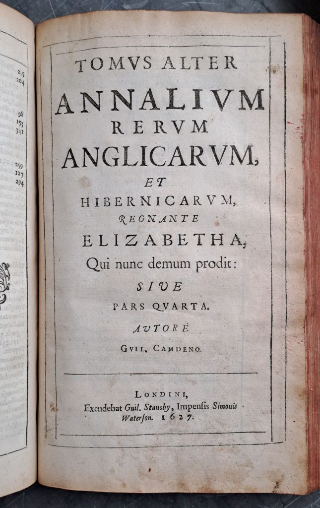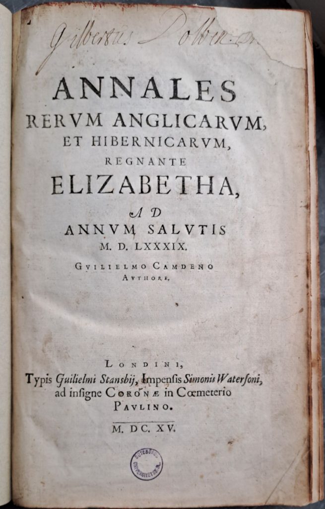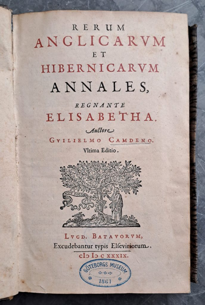 Döm om glädjen som spred sig i nattmörkret då jag upptäckte att Humanistiska biblioteket äger både 1615 års utgåva tryckt i London, sammanbunden med bok 4 från 1627, samt den senare upplagan, Rerum anglicarum et hibernicarum annales regnante Elisabetha, ”ultima editio” från 1639, tryckt i Leiden.