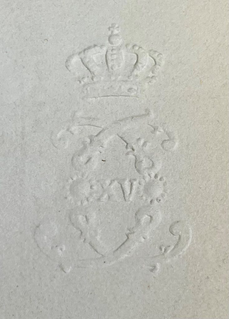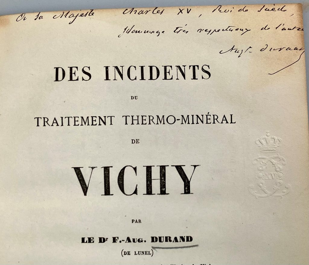 Den ovannämnda, säkerligen fascinerade exposén över incidenter rörande termomineralbehandlingen i Vichy har även en dedikation på titelsidan från den stolte författaren. Denna bok uppvisar också ännu ett sätt att markera bokägande, med hjälp av blindstämpel. Denna blindstämpel återkommer i ett flertal av Karl XV:s böcker i Bokbandssamlingen.