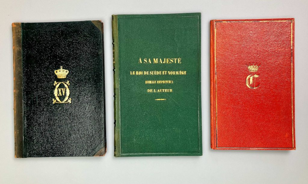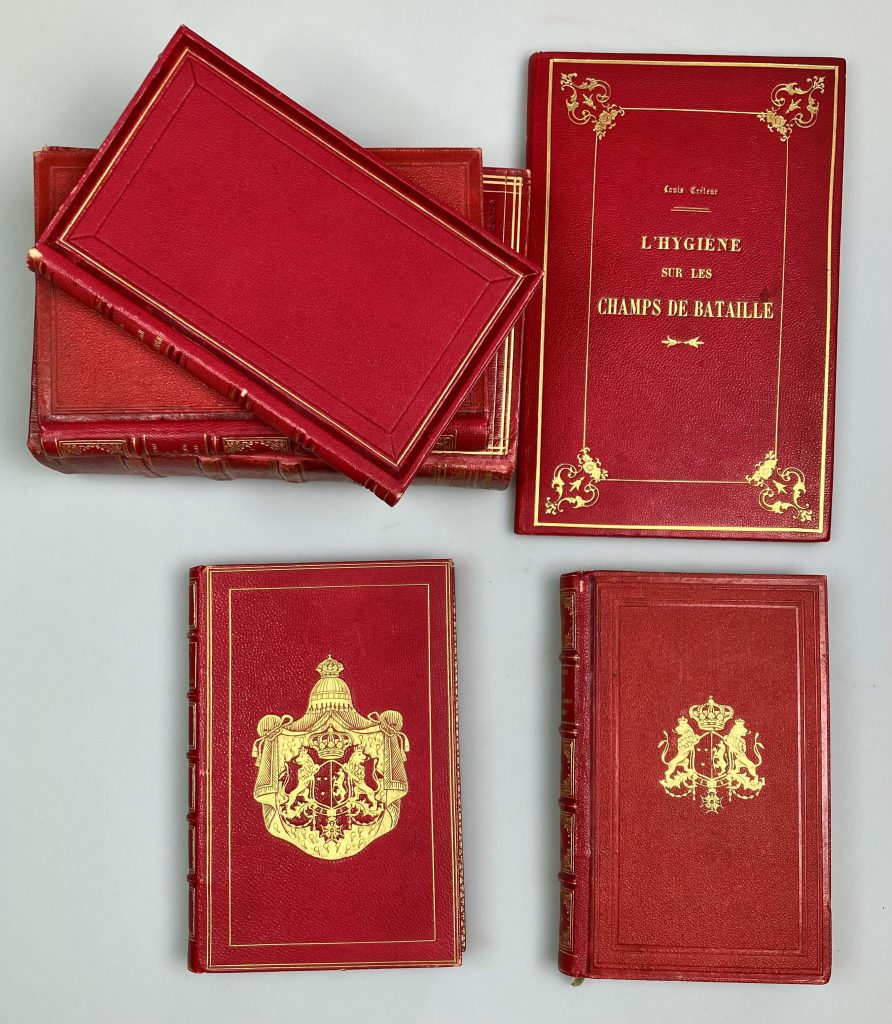 Längst till vänster har vi Des Incidents du traitement thermo-minéral de Vichy, av François Auguste Durand, i ett mörkgrönt halvband med Karl XV förgyllda pärmexlibris. Detta kan jämföras med bokbandet längst till höger, Om Sundhedsvæsenet ombord paa danske Krigsskibe, av Frederik Vilhelm Mansa, i ett rött klotband, även detta med förgyllt pärmexlibris. Detta pärmexlibris är dock inte kung Karls utan kronprins Karls, vilket förlägger bokbandet till en tidpunkt innan Karl besteg tronen 1859. Mellan dem har vi Typhus contagieux du gros bétail, av Eugène Renault, i halvband med rygg i grön chagrin och pärmar i chagrinpressad klot, med ett förgyllt dedikationstryck på främre pärm.