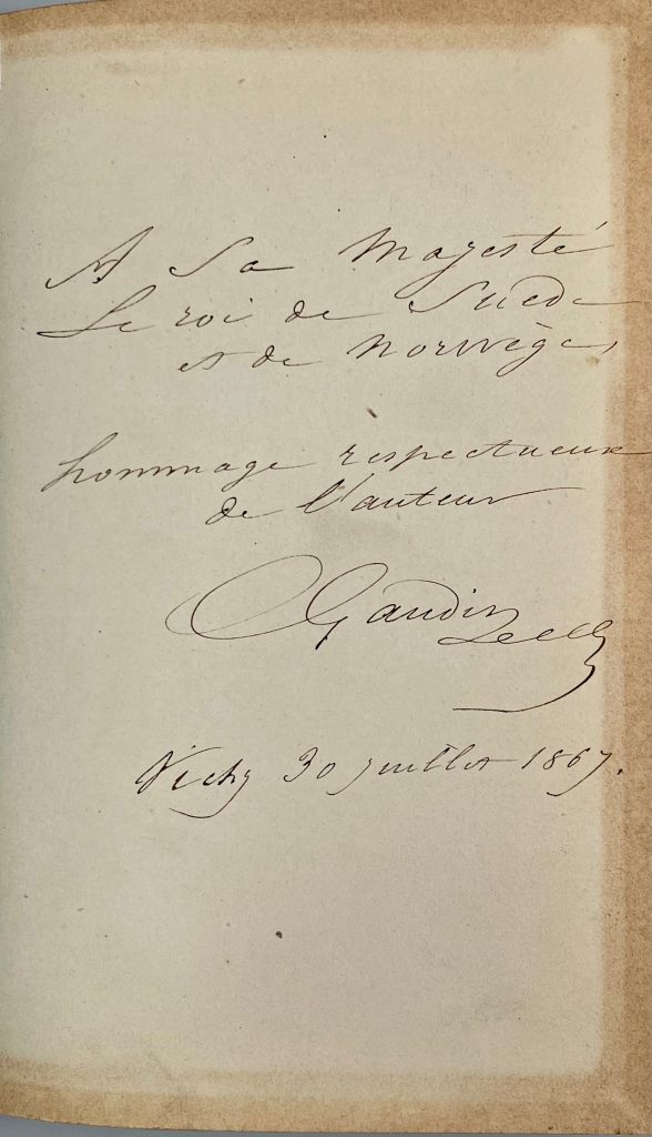 Här är ännu ett halvdussin av Karl XV:s böcker från Bokbandssamlingen (nummer 76, 77, 78, 81, 82, 87). En gemensam nämnare för dessa, och några till, är ”chagrin”. Chagrin är benämningen på det skinn som bandet är gjort av. Från början var chagrin vanligtvis skinn från åsna eller häst, men betecknar under senare tid oftast getskinn. Ordet kommer från franskas ord för ”sorg” (chagrin), man chagrinerade skinnet, gav det ett utseende av sorg. Passande för alla dessa böcker om sjukdom? På de två nedersta böckerna ser vi också två exempel på Karl XV:s förgyllda pärmsigill. Det större av dem syns på Vichy au point de vue de l’hygiène et du traitement, av Dr C. Gaudin. Detta band har dekorerats lite extra med förgyllda inre denteller, det vill säga en dekorbård på insidan av pärmen. Den gode doktorn och författaren har dessutom inte kunnat behärska sig utan dedikerat försättsbladet med sedvanlig högtidlighet 30 juli 1867, se nedan.