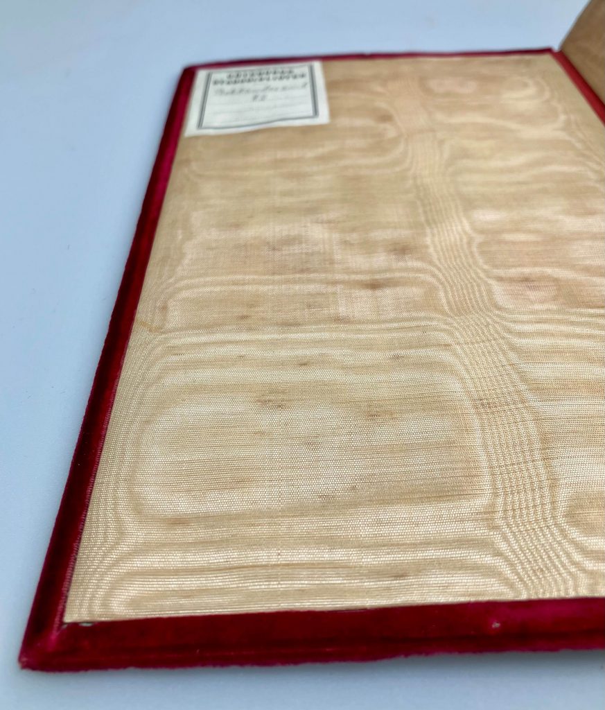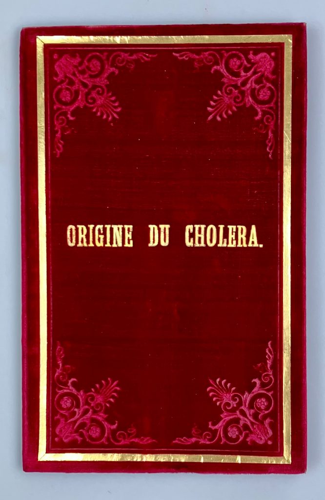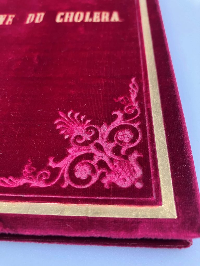 Vi avslutar denna rundtur bland Karl XV:s medicinska och hydroterapeutiska bokband med ett band i sammet. Varför sammet? Hade det med ämnet att göra? Något mysigt, mjukt, värmande ämne? Boken är Origine du Cholera (om kolerans ursprung), av Axel Frederick Lassen. Så – nej. Sammet användes främst för att det var exklusivt, även om det på 1800-talet blivit mindre exklusivt. Låt gå, vi tittar på sammetsbandet, som är ett helband i röd sammet, med förgylld titel och bård, samt med blindpressad dekor och försättsblad av sidenmoiré. Varför inte, så att säga. (Hur många bakterier döljer sig i den exklusiva luggen?)