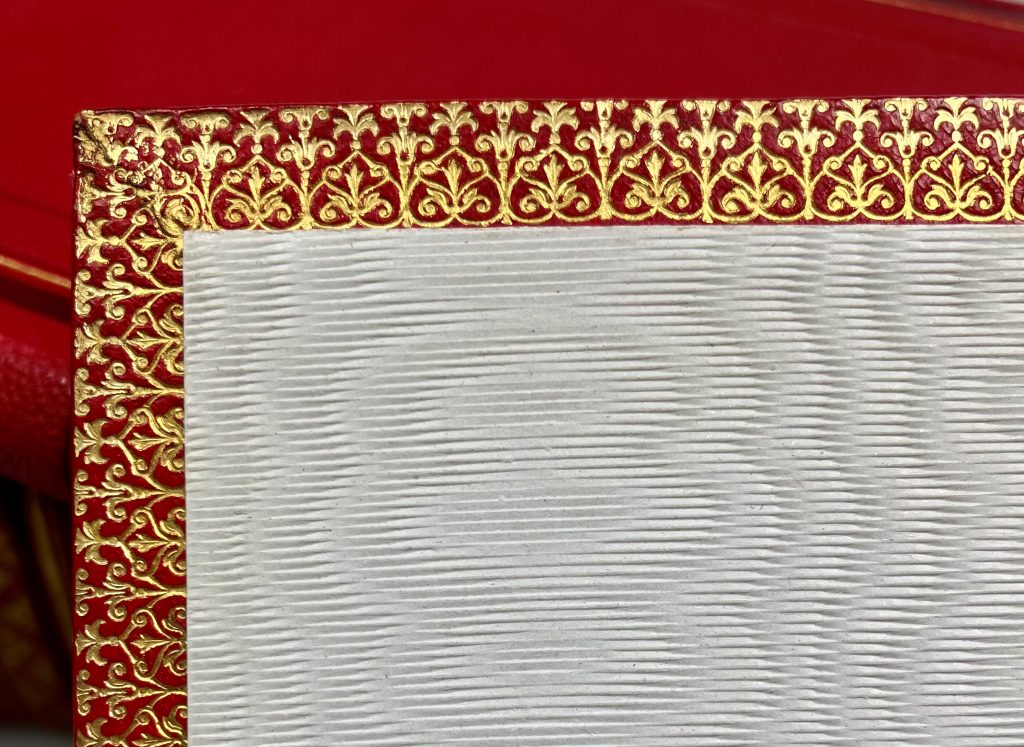 Om det militaire medicinalvæsen av J. de Besch är ett elegant rött saffianband med förgylld dekor. Som alla böcker gör den sig bättre i verkligheten än på bild – men vad ska man göra. Marginalia är trots allt en blogg.