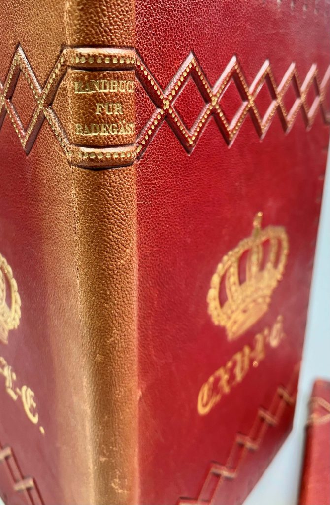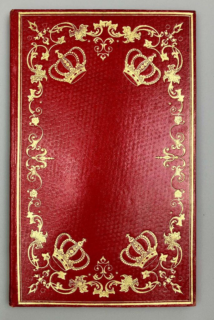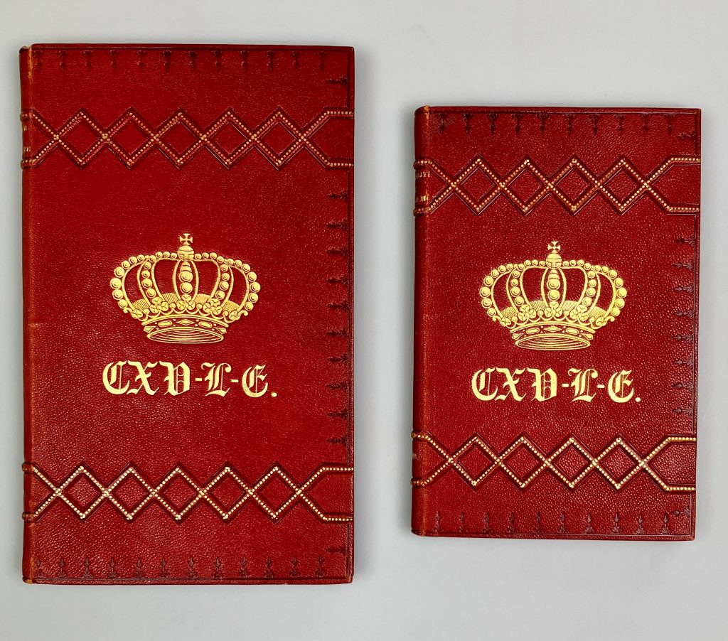 På nästa bild finner vi ett exempel på dubbla pärmmonogram. Böckerna är Unerlässliches Handbuch für Badegäste zu Ostende, och Supériorité des bains de mer contre les dérangements de santé de la femme, båda av Heinrich Noppe. Pärmmonogrammen, CXV – L-E är alltså både Karl XV:s och drottning Lovisas (Louise van Oranje-Nassau). Det framgår inte om de var på gemensam kurresa till Ostende eller om drottningen var där själv (andra titeln handlar om hur man medelst bad botar specifikt kvinnliga sjukdomar lika ineffektivt som baden botar manliga), men banden anger dem bägge som ägare. Bokbanden är för övrigt bundna i Ostende, av Deweirt. De är röda chagrinband, med förhöjd och förgylld skinndekor, dekor i blindtryck, förgylld krona och monogram, pärmdekor och inre denteller. Så … inget sparat.