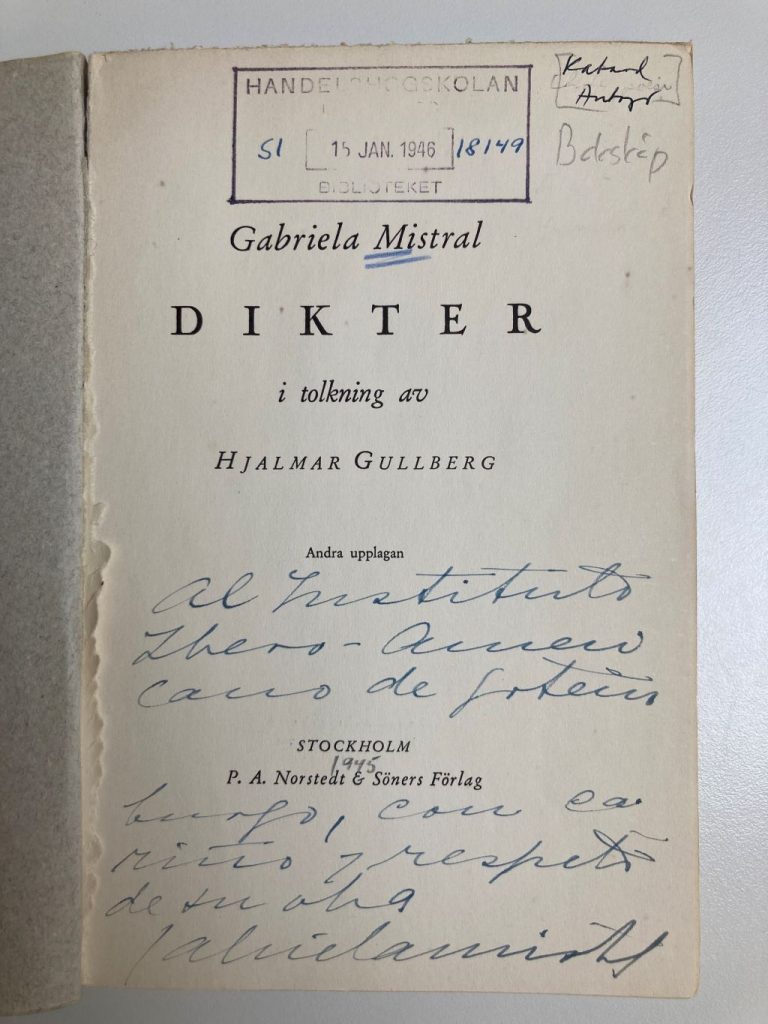I dag är det exakt 80 år sedan den chilenska poeten Gabriela Mistral anlände till Göteborgs hamn, på väg till Stockholm för att som första latinamerikan någonsin ta emot Nobelpriset i litteratur. I Göteborgs universitetsbiblioteks samlingar finns ett signerat bokexemplar som härrör från hennes Sverigebesök, ”Till Göteborgs iberoamerikanska institut, med tillgivenhet och respekt för dess arbete / Gabriela Mistral”: