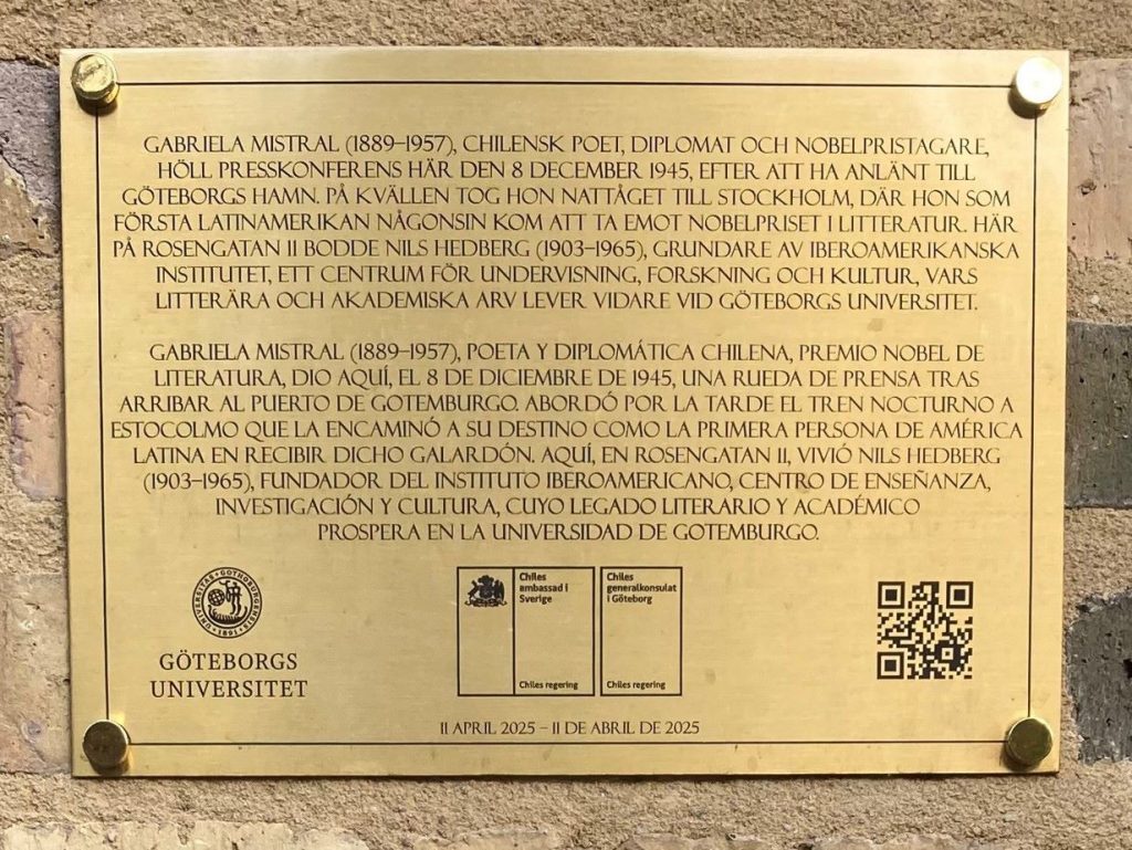 I Göteborgs hamn möttes Mistral av bland andra Matilde Goulard, spansklärare och tillförordnad föreståndare för stadens Iberoamerikanska institut. Institutets grundare och ordinarie föreståndare, Nils Hedberg, befann sig vid tillfället i Brasilien, men Mistral fick tillträde till hans lägenhet på Rosengatan för att kunna gå igenom alla telegram som väntade på henne efter Atlantresan och för att hålla en presskonferens. Tidigare i år invigdes en minnesskylt på byggnadens fasad: