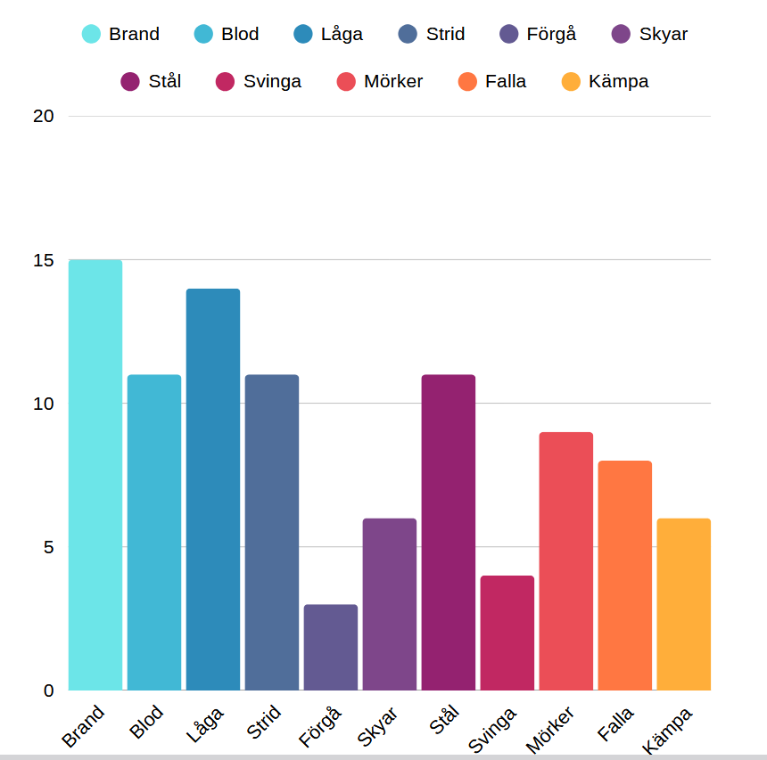 En intressant kvantitativ studie vore att tröska ut de 20-30 vanligaste orden ur dessa repetitiva grötrim versrader författade av allvarliga, allmänbildade herrar med armbågslappar. Dåtidens poesi utgör sitt eget litterära bevis för folkhemmets osvängiga villkor. Ordbilden skvallrar främst om en av samhället förkvävd sexualitet och ett orimligt sug bland prostsöner, botaniker och kamrerare att få delta i olika nationalromantiska actionscener framvevade i slow motion på önsketänkadets bioduk. I väntan på faktiskt underlag från GRIDH bifogas nedan ett diagram baserat på magkänsla snarare än några egentliga mätningar: