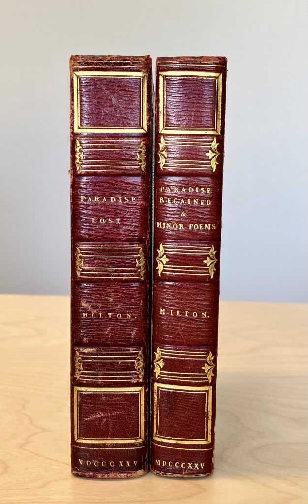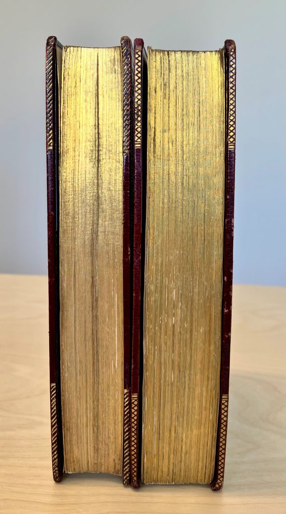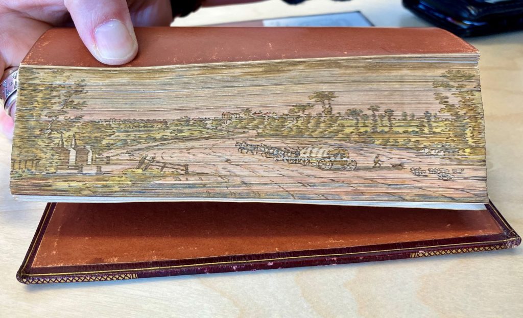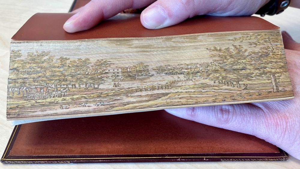 Man har skrivit och målat på böckernas snitt sedan 900-talet, men det var först på 1600-talet som man i England insåg att man listigt kunde dölja målningarna och på så sätt skapa en trevlig överraskning för den intet ont anande läsaren. Detta görs genom att man sprider snittet innan man målar det och därefter förgyller man det raka snittet. Detta gör att målningen inte syns när boken är hopslagen eller när en läsare förstrött bläddrar sida för sida. Målningen framträder först när man sprider snittet. Det är ingen överdrivet vanlig form av bokkonst, men i bibliotekets samlingar dyker det då och då upp böcker med dolda framsnittsmålningar. Här är ett par fina exempel från vår Bokbandssamling. Böckerna är Miltons Paradise lost (1825), samt Paradise regained & minor poems (1817). Just dessa böcker fick en man vid namn John Bullock sent i april år 1831, som en gåva från sin mor, vilket han prydligt noterat i båda böckerna. Motivet lär vara Highgate i närheten av London, sedd från Upper Holloway.